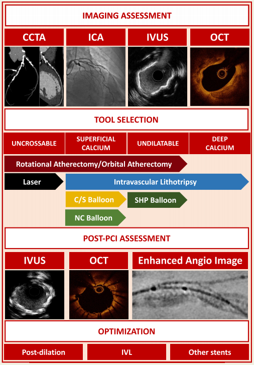 尽管CCTA可以预测不可扩张的病变和病变修饰的需要(每个病变钙化评分≥453分),但其在临床实践中仍未得到充分利用。如果血管内超声(IVUS)或光学相干断层成像(OCT)导管能够通过,应评估钙负荷,并指导斑块修饰技术。